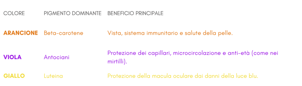 Ogni colore della carota indica la prevalenza di un diverso fitonutriente. Consumarle tutte garantisce uno spettro completo di antiossidanti.