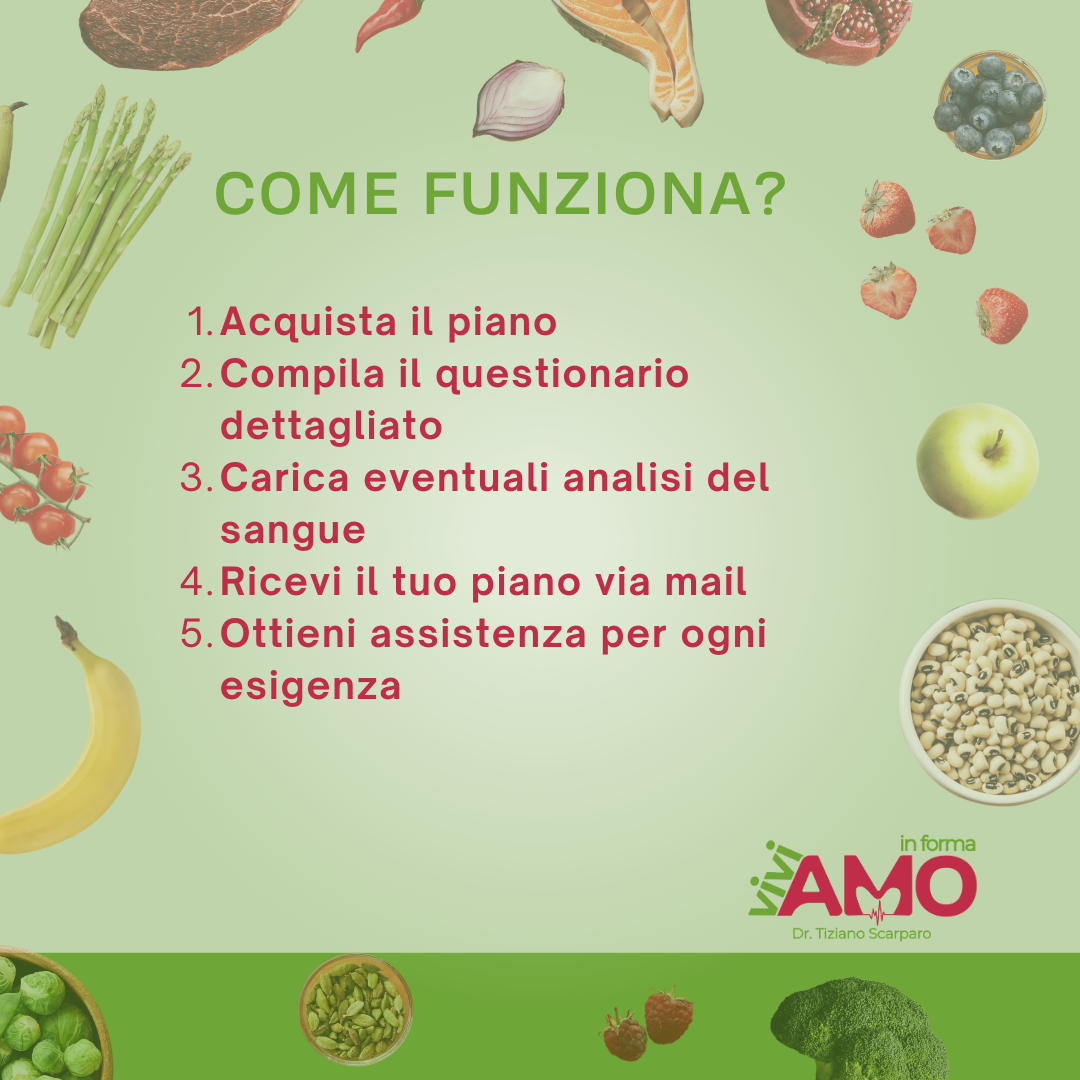 Dopo l’acquisto, riceverai un questionario dettagliato in cui potrai indicare le tue abitudini alimentari, eventuali intolleranze, obiettivi e preferenze. È fondamentale compilarlo con la massima precisione, perché ogni dettaglio sarà utile per creare un piano alimentare realmente efficace per te.