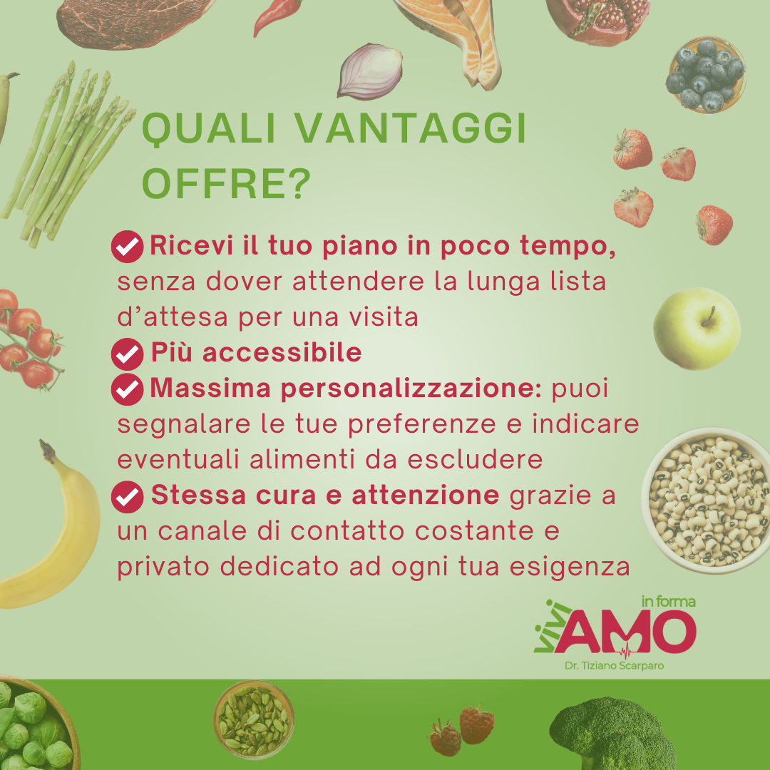 • Direttamente sulla tua mail, un piano alimentare completamente personalizzato sulla base dei tuoi parametri personali e delle tue esigenze.